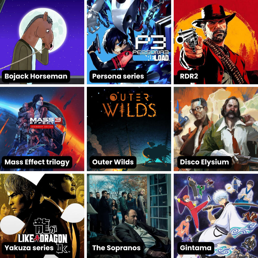 (bold) indicates it being something i’m very interested in.csgo and csgo esports, persona, outer wilds, fromsoft games, the yakuza series, the weeknd, vylet pony, gintama, rdr2, hip hop music